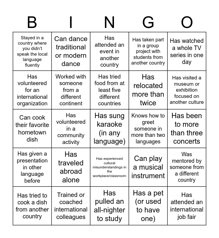 This bingo card has a free space and 24 words: Has traveled abroad alone, Trained or coached international colleagues, Has tried food from at least five different countries, Has tried to cook a dish from another country, Has watched a whole TV series in one day, Stayed in a country where you didn’t speak the local language fluently, Has volunteered for an international organization, Can dance traditional or modern dance, Knows how to greet someone in more than two languages, Has experienced cultural misunderstandings in the workplace/classroom, Has relocated more than twice, Can cook their favorite hometown dish, Can play a musical instrument, Was mentored by someone from a different country, Worked with someone from a different continent, Has a pet (or used to have one), Has been to more than three concerts, Has attended an event in another country, Has visited a museum or exhibition focused on another culture, Has volunteered in a community activity, Has attended an international job fair, Has given a presentation in other language before, Has taken part in a group project with students from another country and Has pulled an all-nighter to study.