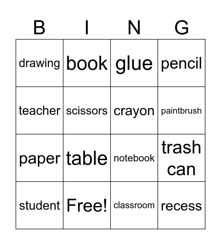This bingo card has 21 words: Free!, backpack, book, chair, classroom, crayon, drawing, glue, notebook, paintbrush, paper, pencil, recess, school, scissors, stickers, student, table, teacher, trash can and red.