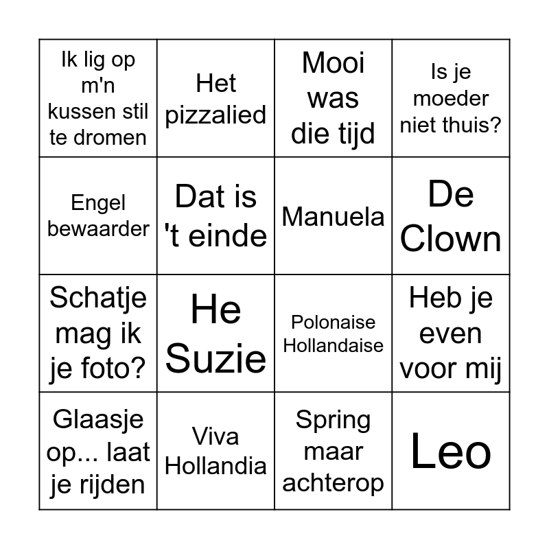 This bingo card has 30 words: m'n Opa, De Troubadour, Heb je even voor mij, Guus kom naar huus, Ik lig op m'n kussen stil te dromen, Mooi was die tijd, Manuela, Rock around the clock, Viva Hollandia, Paradiso, Spring maar achterop, Glaasje op... laat je rijden, Blueberry Hill, Mooi man, He Suzie, Annie, hou jij m'n tassie even vast, Naar de kermis, Leo, skûtsje silen, Engel bewaarder, Polonaise Hollandaise, Rozen voor Sandra, Het pizzalied, Schatje mag ik je foto?, Dat is 't einde, Is je moeder niet thuis?, Huilen is voor jou te laat, Ga maar weg, De Clown and Smurfen lied.