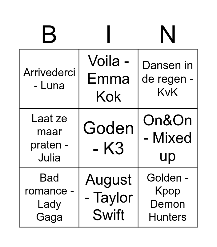 This bingo card has a free space and 11 words: Baila - Effe serieus, August - Taylor Swift, Golden - Kpop Demon Hunters, Bad romance - Lady Gaga, Voila - Emma Kok, Dansen in de regen - KvK, On&On - Mixed up, Anti hero - Taylor Swift, Laat ze maar praten - Julia, Arrivederci - Luna and Chicken banana.