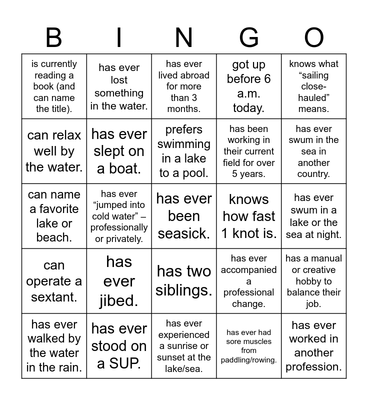 This bingo card has a free space and 24 words: has ever jibed., has ever stood on a SUP., prefers swimming in a lake to a pool., has ever walked by the water in the rain., knows what “sailing close-hauled” means., is currently reading a book (and can name the title)., can relax well by the water., has ever lost something in the water., knows how fast 1 knot is., has two siblings., has been working in their current field for over 5 years., can name a favorite lake or beach., has ever accompanied a professional change., has a manual or creative hobby to balance their job., has ever slept on a boat., has ever had sore muscles from paddling/rowing., has ever swum in a lake or the sea at night., has ever lived abroad for more than 3 months., has ever swum in the sea in another country., has ever “jumped into cold water” – professionally or privately., has ever worked in another profession., can operate a sextant., got up before 6 a.m. today. and has ever experienced a sunrise or sunset at the lake/sea..