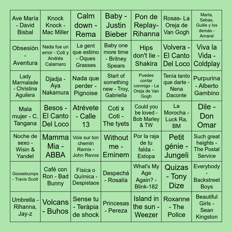 This bingo card has 50 words: Everybody - Backstreet Boys, Volvera - El Canto Del Loco, Roxanne - The Police, Besos - El Canto Del Loco, Nada que perder - Pignoise, Without me - Eminem, Knock Knock - Mac Miller, Princesas - Pereza, Rosas- La Oreja de Van Gogh, Por la raja de tu falda - Estopa, Marta, Sebas, Guille y los demás - Amaral, Baby - Justin Bieber, Tenía tanto que darte - Nena Daconte, Puedes contar conmigo - La Oreja de Van Gogh, Física o Química - Despistaos, Dile - Don Omar, Obsesión - Aventura, Viva la Vida - Coldplay, Umbrella - Rihanna, Jay-z, Pon de Replay- Rihanna, Hips don't lie - Shakira, Atrévete - Calle 13, Ave María - David Bisbal, Nada fue un error - Coti y Andrés Calamaro, Volcans - Buhos, Coti x Coti - The tyets, La gent que estimo - Oques Grasses, Sense tu - Teràpia de shock, Calm down - Rema, Start of something new - Troy, Gabriella, Sk8ater Boi - Avril Lavigne, Noche de sexo - Wisin & Yandel, Café con Ron - Bad Bunny, Despechá - Rosalía, Mala mujer - C. Tangana, La Morocha - Luck Ra, BM, Petit génie - Jungeli, Such great heights - The Postal Service, Goosebumps - Travis Scott, Lady Marmalade - Christina Aguilera, Vois sur ton chemin Remix - John Revox, What's My Age Again? - Blink-182, Mamma Mia - ABBA, Island in the sun - Weezer, Purpurina - Alberto Gambino, Baby one more time - Britney Spears, Could you be loved - Bob Marley & TW, Quizas - Tony Dize, Djadja - Aya Nakamura and Beautiful Girls - Sean Kingston.