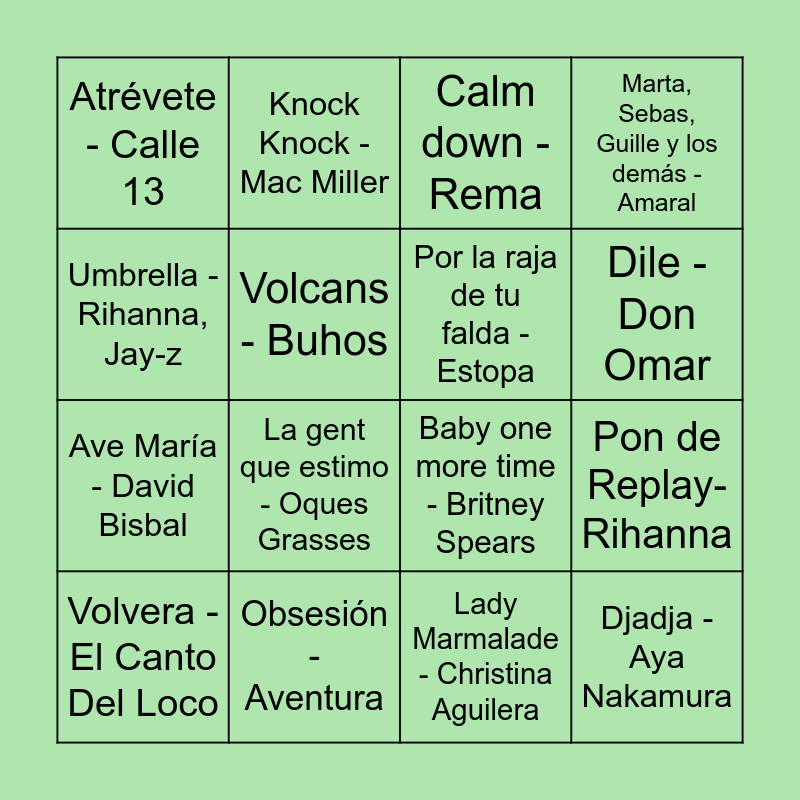 This bingo card has 50 words: Everybody - Backstreet Boys, Volvera - El Canto Del Loco, Roxanne - The Police, Besos - El Canto Del Loco, Nada que perder - Pignoise, Without me - Eminem, Knock Knock - Mac Miller, Princesas - Pereza, Volcans - Buhos, Rosas- La Oreja de Van Gogh, Por la raja de tu falda - Estopa, Marta, Sebas, Guille y los demás - Amaral, Baby - Justin Bieber, Tenía tanto que darte - Nena Daconte, Puedes contar conmigo - La Oreja de Van Gogh, Física o Química - Despistaos, Dile - Don Omar, Obsesión - Aventura, Viva la Vida - Coldplay, Umbrella - Rihanna, Jay-z, Pon de Replay- Rihanna, Hips don't lie - Shakira, Atrévete - Calle 13, Ave María - David Bisbal, Nada fue un error - Coti y Andrés Calamaro, Coti x Coti - The tyets, La gent que estimo - Oques Grasses, Sense tu - Teràpia de shock, Calm down - Rema, Start of something new - Troy, Gabriella, Sk8ater Boi - Avril Lavigne, Noche de sexo - Wisin & Yandel, Café con Ron - Bad Bunny, Despechá - Rosalía, Mala mujer - C. Tangana, La Morocha - Luck Ra, BM, Petit génie - Jungeli, Such great heights - The Postal Service, Goosebumps - Travis Scott, Lady Marmalade - Christina Aguilera, Vois sur ton chemin Remix - John Revox, What's My Age Again? - Blink-182, Mamma Mia - ABBA, Island in the sun - Weezer, Purpurina - Alberto Gambino, Baby one more time - Britney Spears, Could you be loved - Bob Marley & TW, Quizas - Tony Dize, Djadja - Aya Nakamura and Beautiful Girls - Sean Kingston.