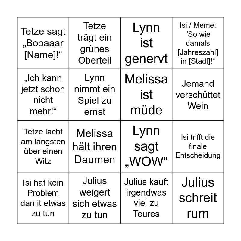 This bingo card has 16 words: Julius weigert sich etwas zu tun, Isi trifft die finale Entscheidung, Lynn ist genervt, Tetze sagt „Booaaar [Name]!“, Tetze lacht am längsten über einen Witz, Tetze trägt ein grünes Oberteil, Lynn sagt „WOW“, Julius kauft irgendwas viel zu Teures, „Ich kann jetzt schon nicht mehr!“, Lynn nimmt ein Spiel zu ernst, Isi hat kein Problem damit etwas zu tun, Isi / Meme: "So wie damals [Jahreszahl] in [Stadt]!“, Melissa hält ihren Daumen, Jemand verschüttet Wein, Melissa ist müde and Julius schreit rum.