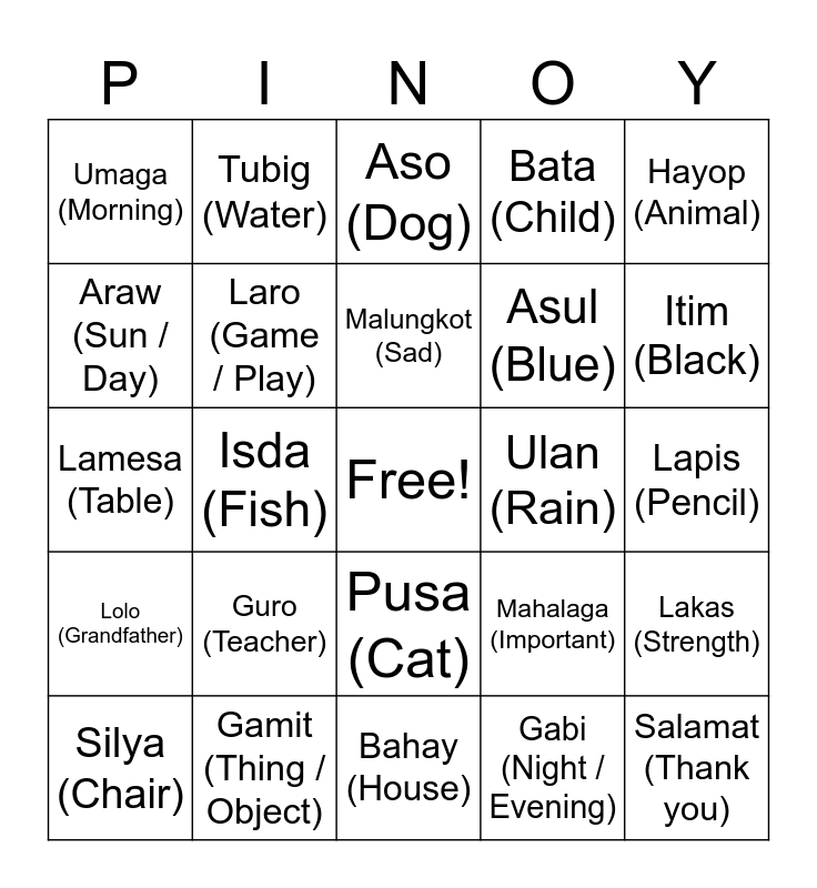 This bingo card has a free space and 50 words: Maganda (Beautiful), Salamat (Thank you), Kaibigan (Friend), Bahay (House), Guro (Teacher), Pamilya (Family), Tubig (Water), Pagkain (Food), Araw (Sun / Day), Buwan (Moon / Month), Laro (Game / Play), Bata (Child), Lakas (Strength), Mahalaga (Important), Pag-ibig (Love), Masaya (Happy), Malungkot (Sad), Ulan (Rain), Halaman (Plant), Hayop (Animal), Isda (Fish), Gabi (Night / Evening), Umaga (Morning), Asul (Blue), Pula (Red), Dilaw (Yellow), Itim (Black), Puti (White), Aso (Dog), Pusa (Cat), Kamay (Hand), Mata (Eye), Ilong (Nose), Tenga (Ear), Gamit (Thing / Object), Sapatos (Shoes), Damit (Clothes), Kotse (Car), Paaralan (School), Lapis (Pencil), Aklat (Book), Silid (Room), Pintuan (Door), Bintana (Window), Silya (Chair), Lamesa (Table), Inay / Nanay (Mother), Itay / Tatay (Father), Lolo (Grandfather) and Lola (Grandmother).