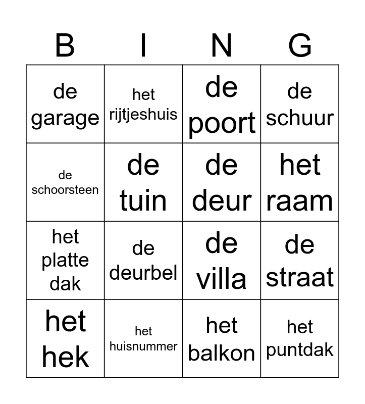 This bingo card has 16 words: het huisnummer, de straat, de poort, de garage, het platte dak, het rijtjeshuis, de villa, het balkon, de schoorsteen, de tuin, het hek, de schuur, de deurbel, het raam, de deur and het puntdak.