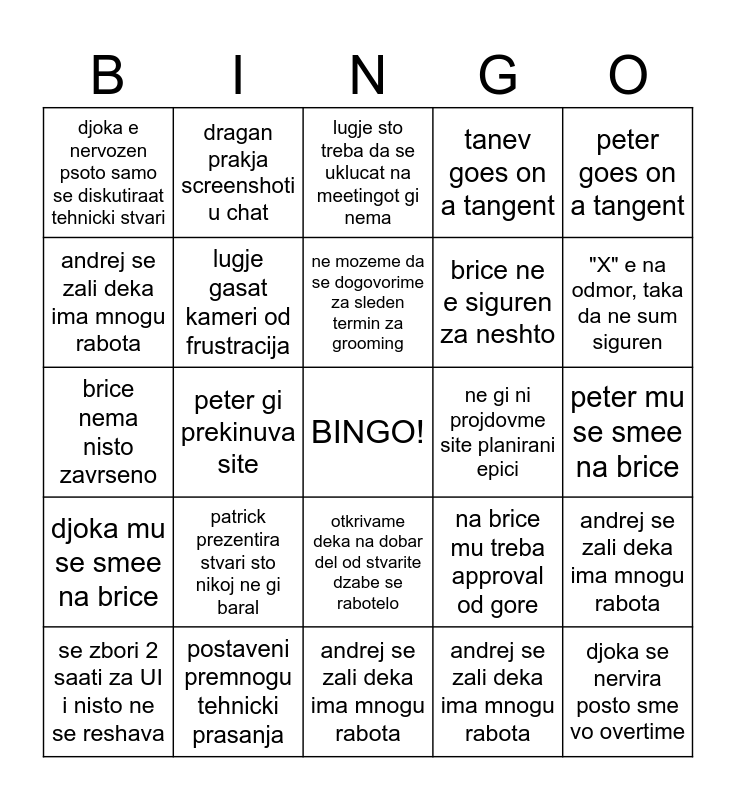 This bingo card has a free space and 24 words: patrick prezentira stvari sto nikoj ne gi baral, postaveni premnogu tehnicki prasanja, ne mozeme da se dogovorime za sleden termin za grooming, se zbori 2 saati za UI i nisto ne se reshava, peter goes on a tangent, djoka e nervozen psoto samo se diskutiraat tehnicki stvari, andrej se zali deka ima mnogu rabota, dragan prakja screenshoti u chat, ne gi ni projdovme site planirani epici, otkrivame deka na dobar del od stvarite dzabe se rabotelo, brice ne e siguren za neshto, brice nema nisto zavrseno, na brice mu treba approval od gore, andrej se zali deka ima mnogu rabota, lugje gasat kameri od frustracija, andrej se zali deka ima mnogu rabota, peter mu se smee na brice, lugje sto treba da se uklucat na meetingot gi nema, "X" e na odmor, taka da ne sum siguren, peter gi prekinuva site, djoka se nervira posto sme vo overtime, djoka mu se smee na brice, tanev goes on a tangent and andrej se zali deka ima mnogu rabota.
