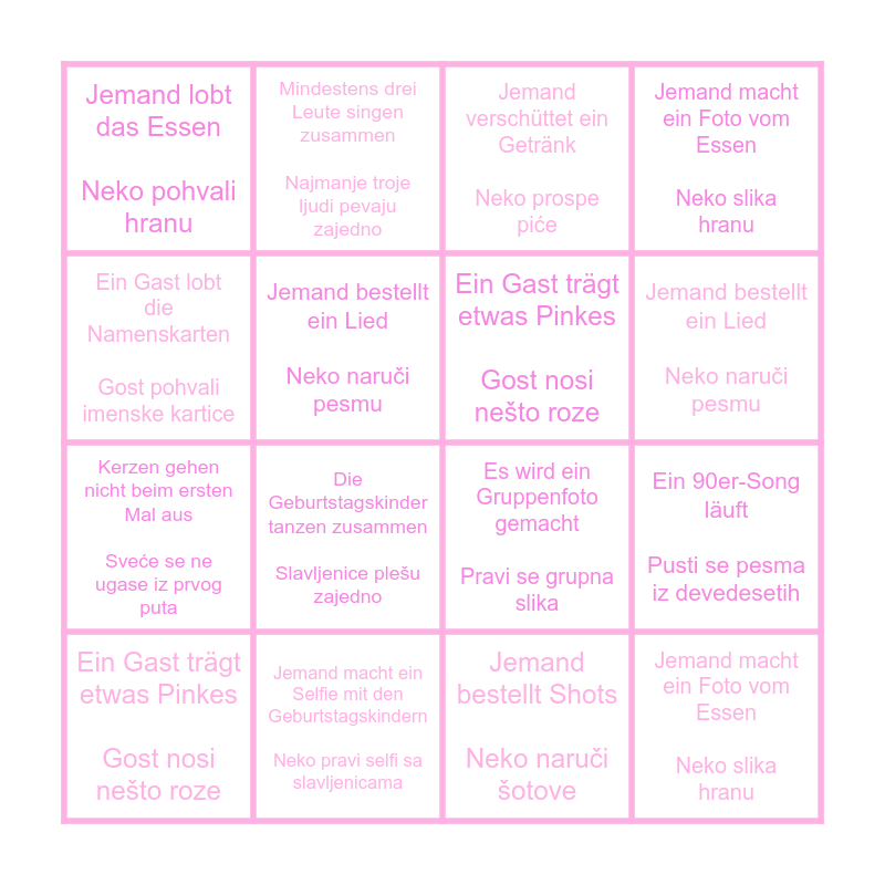 This bingo card has 16 words: Jemand macht ein Selfie mit den Geburtstagskindern Neko pravi selfi sa slavljenicama, Ein 90er-Song läuft Pusti se pesma iz devedesetih, Jemand verschüttet ein Getränk Neko prospe piće, Jemand lobt das Essen Neko pohvali hranu, Kerzen gehen nicht beim ersten Mal aus Sveće se ne ugase iz prvog puta, Mindestens drei Leute singen zusammen Najmanje troje ljudi pevaju zajedno, Es wird ein Gruppenfoto gemacht Pravi se grupna slika, Jemand bestellt Shots Neko naruči šotove, Ein Gast lobt die Namenskarten Gost pohvali imenske kartice, Jemand bestellt ein Lied Neko naruči pesmu, Ein Gast trägt etwas Pinkes Gost nosi nešto roze, Jemand macht ein Foto vom Essen Neko slika hranu, Die Geburtstagskinder tanzen zusammen Slavljenice plešu zajedno, Jemand bestellt ein Lied Neko naruči pesmu, Ein Gast trägt etwas Pinkes Gost nosi nešto roze and Jemand macht ein Foto vom Essen Neko slika hranu.