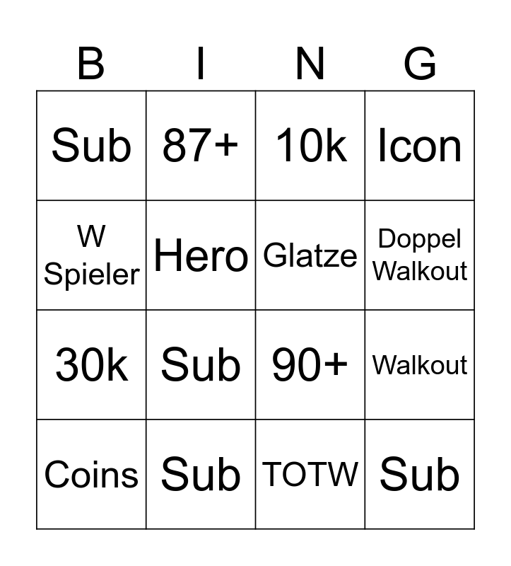 This bingo card has 16 words: Sub, Walkout, 10k, Sub, 30k, 87+, 90+, TOTW, W Spieler, Hero, Coins, Icon, Sub, Doppel Walkout, Glatze and Sub.
