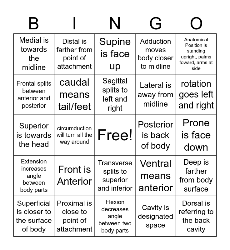 This bingo card has a free space and 24 words: Front is Anterior, Proximal is close to point of attachment, Sagittal splits to left and right, Superficial is closer to the surface of body, Anatomical Position is standing upright, palms foward, arms at side, Medial is towards the midline, Frontal splits between anterior and posterior, Distal is farther from point of attachment, Posterior is back of body, Transverse splits to superior and inferior, Lateral is away from midline, Superior is towards the head, Ventral means anterior, Deep is farther from body surface, caudal means tail/feet, Cavity is designated space, Prone is face down, Supine is face up, rotation goes left and right, circumduction will turn all the way around, Dorsal is referring to the back cavity, Extension increases angle between body parts, Adduction moves body closer to midline and Flexion decreases angle between two body parts.