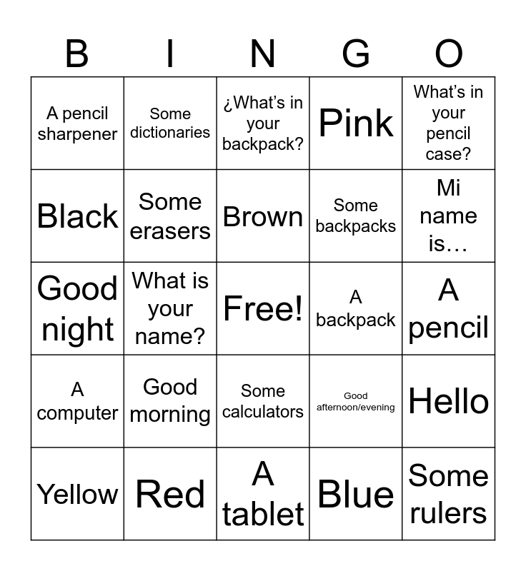 This bingo card has a free space and 29 words: Yellow, A pen, What is your name?, A notebook/copy, A pencil sharpener, ¿What’s in your backpack?, Some erasers, Good morning, A backpack, Red, A pencil, Some rulers, A tablet, Blue, Mi name is…, A folder, Some calculators, A computer, What’s in your pencil case?, Good night, Good afternoon/evening, Green, Some backpacks, Black, Pink, Some dictionaries, Hello, Brown and White.