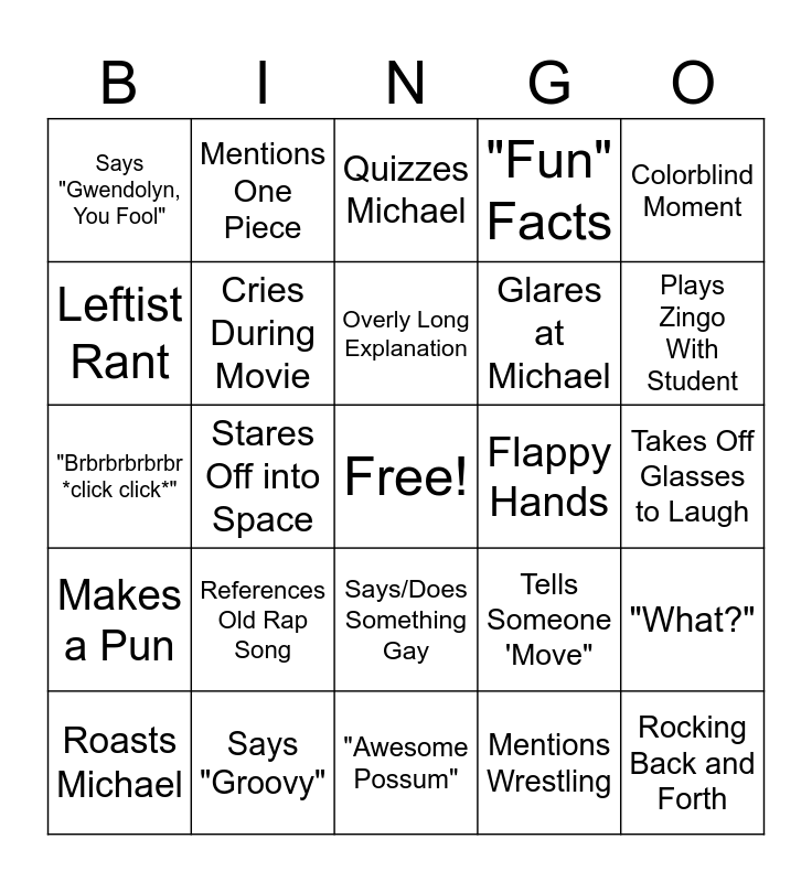This bingo card has a free space and 24 words: Roasts Michael, References Old Rap Song, Overly Long Explanation, Mentions Wrestling, Colorblind Moment, Says "Gwendolyn, You Fool", Mentions One Piece, Quizzes Michael, Flappy Hands, Takes Off Glasses to Laugh, "Brbrbrbrbrbr *click click*", Cries During Movie, Tells Someone 'Move", "What?", Leftist Rant, Says "Groovy", "Awesome Possum", "Fun" Facts, Plays Zingo With Student, Makes a Pun, Stares Off into Space, Says/Does Something Gay, Glares at Michael and Rocking Back and Forth.