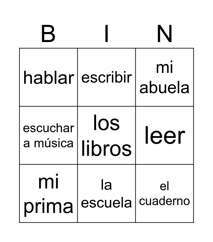 This bingo card has 25 words: mi hermano, mis primos, la escuela, los profesores, los libros, hablar, leer, escribir, estudiar, el lápiz, el cuaderno, los cuadernos, el profesor, mis abuelos, mi prima, mi tía, mi tío, mi abuela, mi papá, el libro, los lapices, cantar, bailar, escuchar a música and mis padres.