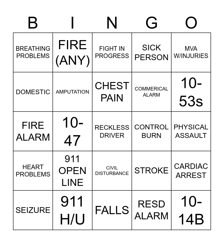 This bingo card has a free space and 24 words: 911 OPEN LINE, 911 H/U, CHEST PAIN, SEIZURE, MVA W/INJURIES, BREATHING PROBLEMS, DOMESTIC, FIRE (ANY), CONTROL BURN, CIVIL DISTURBANCE, COMMERICAL ALARM, FIRE ALARM, STROKE, CARDIAC ARREST, AMPUTATION, RESD ALARM, PHYSICAL ASSAULT, FIGHT IN PROGRESS, 10-53s, 10-47, 10-14B, HEART PROBLEMS, SICK PERSON and FALLS.