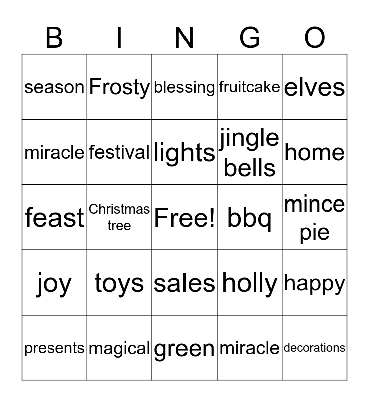 This bingo card has a free space and 75 words: angel, bells, blessing, candles, candy cane, carol, celebration, cheer, chimney, Christ, carols, Christmas Eve, lights, miracle, Christmas pageant, Christmas tree, December, decorations, eggnog, elves, family, feast, festival, Frosty, fruitcake, gathering, gifts, gingerbread, goodwill, greetings, Grinch, ham, holiday, holly, home, jingle bells, joy, Kriss Kringle, mince pie, miracle, mistletoe, North Pole, ornaments, parade, peace, pine, presents, season, reindeer, reunion, Rudolph, sales, Santa, secret Santa, shopping, sled, snowman, stocking, tidings, tinsel, toys, tradition, turkey, winter, summer, bbq, wrapping paper, generous, giving, happy, joy, magical, red, green and special.