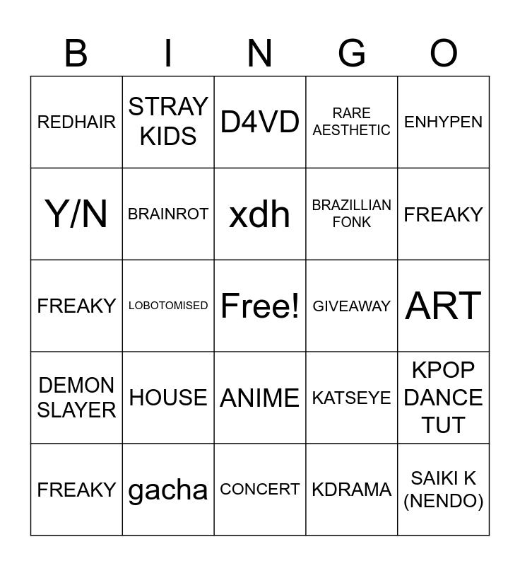 This bingo card has a free space and 24 words: HOUSE, gacha, xdh, FREAKY, ENHYPEN, REDHAIR, Y/N, STRAY KIDS, GIVEAWAY, ANIME, BRAZILLIAN FONK, FREAKY, KATSEYE, KPOP DANCE TUT, BRAINROT, KDRAMA, ART, D4VD, FREAKY, LOBOTOMISED, SAIKI K (NENDO), DEMON SLAYER, RARE AESTHETIC and CONCERT.