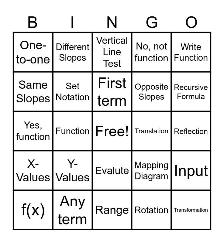 This bingo card has a free space and 31 words: Range, Domain, Function, Rotation, One-to-one, Vertical Line Test, Set Notation, Mapping Diagram, Translation, Rotation, Reflection, Transformation, Arithmetic, Explicit Formula, Recursive Formula, Output, Input, Y-Values, X-Values, Evalute, Write Function, Graph Function, f(x), Different Slopes, Opposite Slopes, Same Slopes, No, not function, Yes, function, Any term, First term and A(n-1).