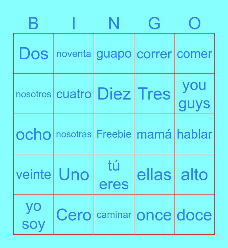 This bingo card has a free space and 24 words: Uno, Cero, Diez, yo soy, comer, Dos, nosotros, noventa, mamá, tú eres, Tres, ocho, ellas, alto, cuatro, once, hablar, guapo, you guys, nosotras, doce, veinte, correr and caminar.