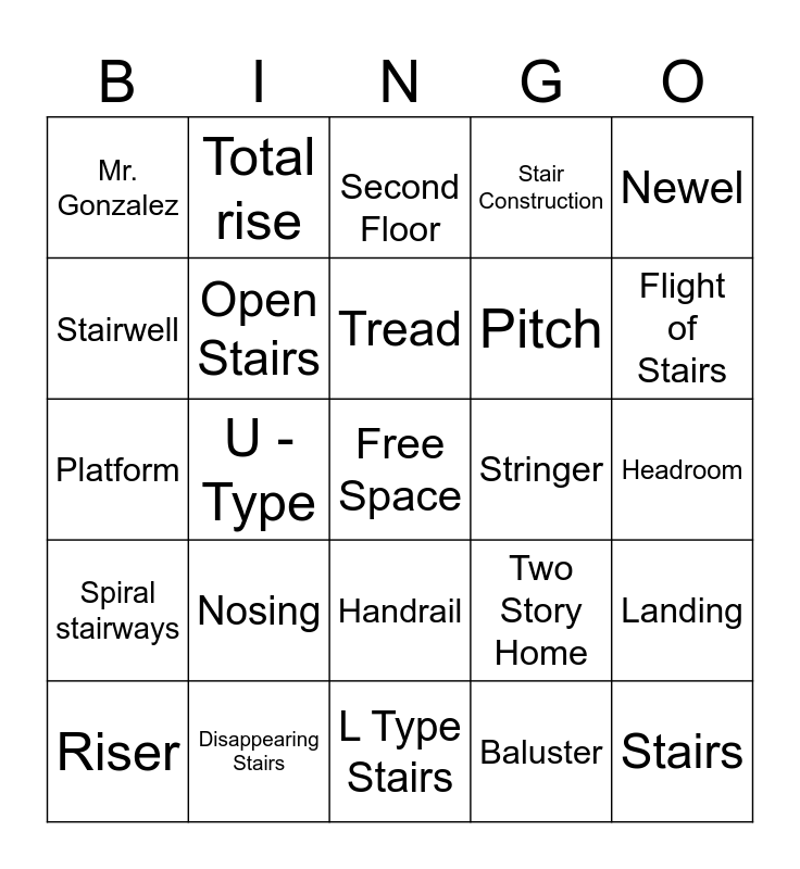 This bingo card has 25 words: Nosing, L Type Stairs, Tread, Riser, Newel, Mr. Gonzalez, Stairwell, Total rise, Stringer, Handrail, Pitch, Platform, Two Story Home, Landing, Open Stairs, Stairs, Headroom, Second Floor, Flight of Stairs, U - Type, Free Space, Disappearing Stairs, Spiral stairways, Stair Construction and Baluster.