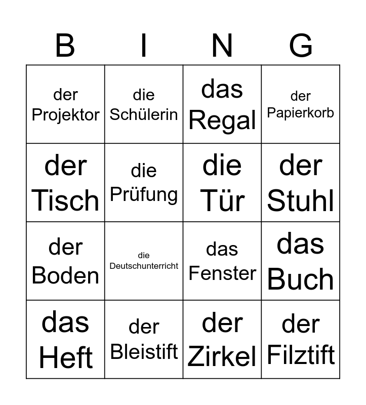 This bingo card has 41 words: die Schule, das Fenster, das Klassenzimmer, die Tür, die Tafel, das Mäppchen, der Stuhl, der Schreibtisch, der Tisch, der Filztift, das Buch, der Papierkorb, das Heft, der Zirkel, der Bleistift, die Zeitung, der Kugelschreiber (der Kuli), der Projektor, der Radiergummi, das Regal, das Lineal, das Klebstoff, die Schere, der Boden, der Rucksack, der Lehrer, die Farben, die Lehrerin, die Deutschunterricht, der Schüler, die Flur, die Schülerin, die Klasse, die Pause, die Hausaufgabe, die Prüfung, die Lehrerinnen, lernen, schreiben, lesen and hören.