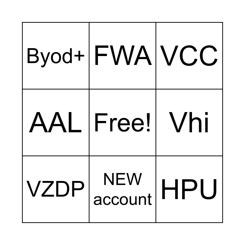 This bingo card has a free space and 8 words: Vhi, VCC, FWA, VZDP, Byod+, HPU, AAL and NEW account.