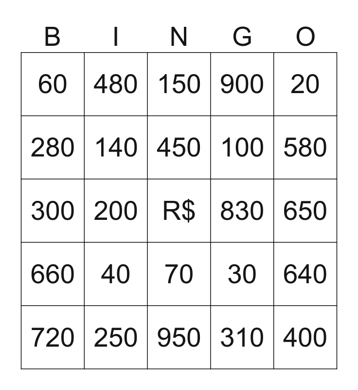 This bingo card has a free space and 24 words: 40, 250, 450, 720, 20, 60, 280, 480, 830, 70, 100, 300, 30, 640, 140, 310, 650, 150, 580, 200, 400, 660, 900 and 950.