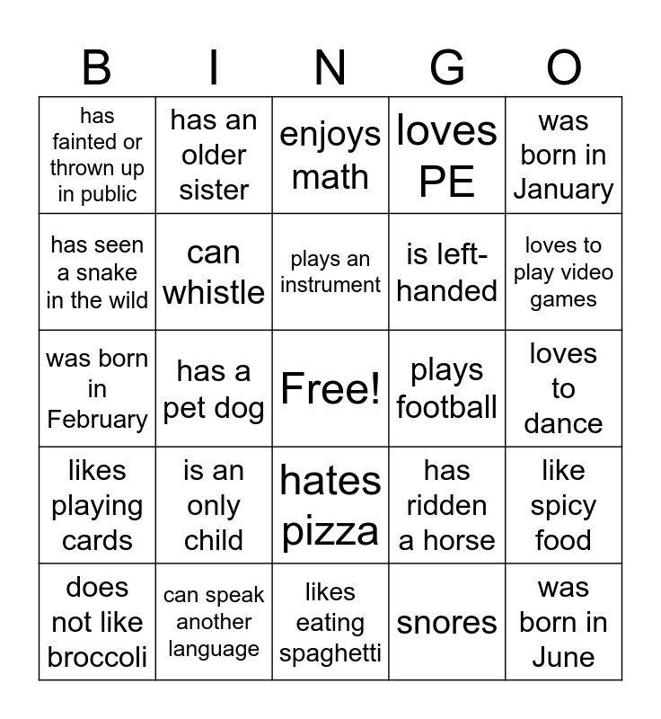This bingo card has a free space and 24 words: is an only child, can speak another language, plays an instrument, does not like broccoli, was born in January, has fainted or thrown up in public, has seen a snake in the wild, has an older sister, plays football, hates pizza, is left-handed, was born in February, has ridden a horse, like spicy food, can whistle, snores, loves to dance, enjoys math, loves to play video games, has a pet dog, was born in June, likes playing cards, loves PE and likes eating spaghetti.