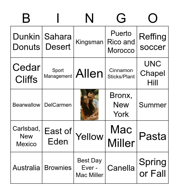 This bingo card has a free space and 36 words: Texas A&M, FISH, Math, Sport Management, Mac Miller, Carlsbad, New Mexico, Allen, Watch sports, Reffing soccer, Right back, DelCarmen, Puerto Rico and Morocco, Yapping, Bronx, New York, UNC Chapel Hill, Dunkin Donuts, 10 miles, East of Eden, Spring or Fall, Kingsman, Summer, Pasta, Brownies, Australia, Best Day Ever - Mac Miller, Sahara Desert, Bearwallow, Giraffe, Cinnamon Sticks/Plant, Cedar Cliffs, Psychology & Human Development and Family Studies, Carrot Cake, Canella, Yellow, Twitter DMs and Trumpet.