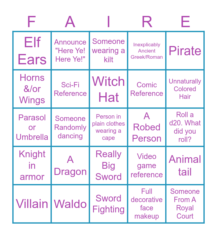 This bingo card has 35 words: A Flower Crown, Cup/drinking horn attached to someone, Goth Person, Sci-Fi Reference, Really Big Sword, Inexplicably Ancient Greek/Roman, Horns &/or Wings, Barbarian, Witch Hat, Walking Stick, Parasol or Umbrella, Pirate, Your Favorite Selfie With Another Fairgoer (action, costume, reference, etc), Hero, Elf Ears, A Robed Person, Full decorative face makeup, Someone Randomly dancing, Knight in armor, Person in plain clothes wearing a cape, Video game reference, Villain, Animal tail, Waldo, Someone wearing a kilt, Unnaturally Colored Hair, Someone From A Royal Court, A Really Cute Kid In A Costume, Comic Reference, Roll a d20. What did you roll?, Jousting, Sword Fighting, A Dragon, Announce "Here Ye! Here Ye!" and A Group Shouting "Huzzah!!".
