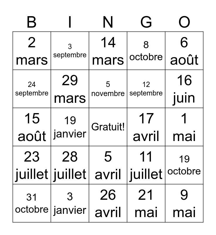 This bingo card has a free space and 30 words: 3 janvier, 7 janvier, 19 janvier, 25 février, 2 mars, 14 mars, 29 mars, 5 avril, 17 avril, 26 avril, 1 mai, 9 mai, 21 mai, 4 juin, 16 juin, 30 juin, 11 juillet, 23 juillet, 28 juillet, 6 août, 15 août, 27 août, 3 septembre, 12 septembre, 24 septembre, 8 octobre, 19 octobre, 31 octobre, 5 novembre and 18 décembre.