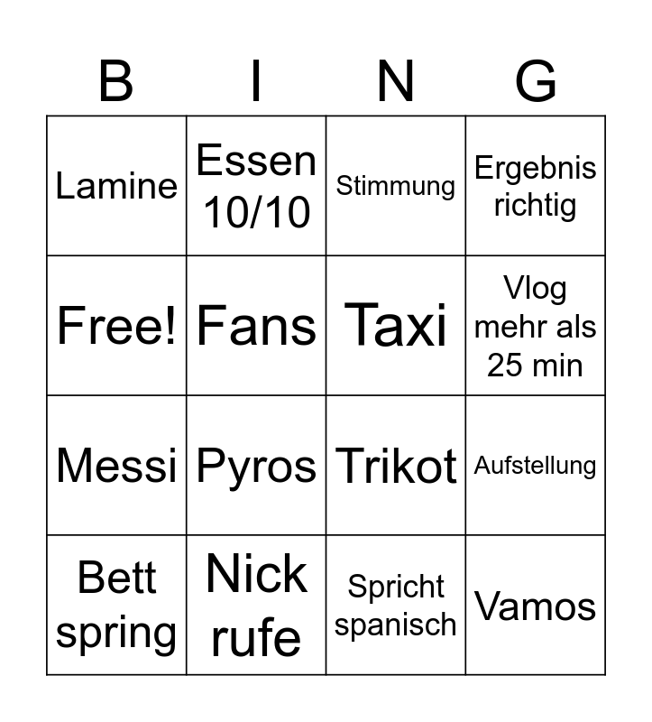 This bingo card has 16 words: Nick rufe, Aufstellung, Stimmung, Lamine, Messi, Essen 10/10, Trikot, Spricht spanisch, Free!, Fans, Bett spring, Ergebnis richtig, Pyros, Vlog mehr als 25 min, Taxi and Vamos.
