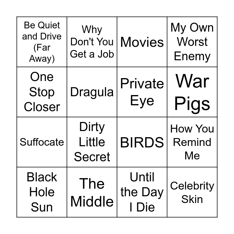 This bingo card has 25 words: Cute Without The 'E', Chop Suey, War Pigs, Juneau, One Stop Closer, Be Quiet and Drive (Far Away), Dragula, Why Don't You Get a Job, The Middle, Buck Rogers, Suffocate, BIRDS, The Bad Touch, No One Knows, Private Eye, Nothing, Until the Day I Die, Movies, Dirty Little Secret, How You Remind Me, Black Hole Sun, Even Flow, Celebrity Skin, My Own Worst Enemy and Creep.