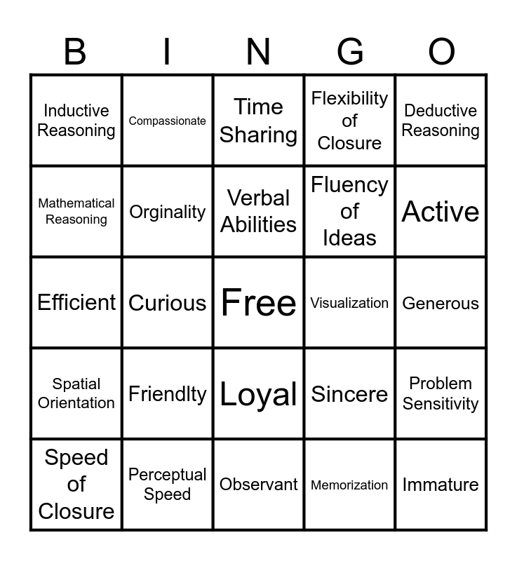 This bingo card has a free space and 59 words: Number Facility, Perceptual Speed, Category Flexibility, Spatial Orientation, Memorization, Quantitative Abilities, Orginality, Written Expression, Fluency of Ideas, Written Comprehension, Flexibility of Closure, Oral Expression, Mathematical Reasoning, Information Ordering, Oral Comprehension, Inductive Reasoning, Immature, Deductive Reasoning, Selective Attention, Verbal Abilities, Visualization, Time Sharing, Speed of Closure, Problem Sensitivity, Memory, Attentiveness, Spatial Abilities, Perceptual Abilities, Active, Calm, Argumentative, Careful, Charming, Clever, Compassionate, Confident, Cooperative, Curious, Determined, Efficient, Fidgety, Friendlty, Generous, Hopeful, Imaginative, Impatient, Jealous, Loving, Loyal, Observant, Persistent, Polite, Quick, Rowdy, Selfish, Sincere, Stubborn, Studious and Trusting.