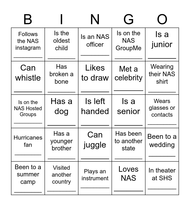 This bingo card has 30 words: Visited another country _________, Has a younger sister, Has a dog ______, Is bilingual _______, Follows the NAS instagram _________, Is an NAS officer ________, Has broken a bone ________, Can juggle ______, Is a senior ______, Plays an instrument _________, Wears glasses or contacts _________, Is left handed ______, Loves NAS _______, In theater at SHS ________, Wearing their NAS shirt ________, Has a birthday in the summer __________, Has been to another state ________, Hurricanes fan ________, Has a younger brother ________, Is a junior ______, Is on the NAS Hosted Groups __________, Plays a sport at SHS ________, Is the oldest child ________, Met a celebrity _______, Can whistle ______, Is on the NAS GroupMe ________, Been to a wedding _______, Been to a summer camp ________, Likes to draw ______ and In another club at SHS ________.