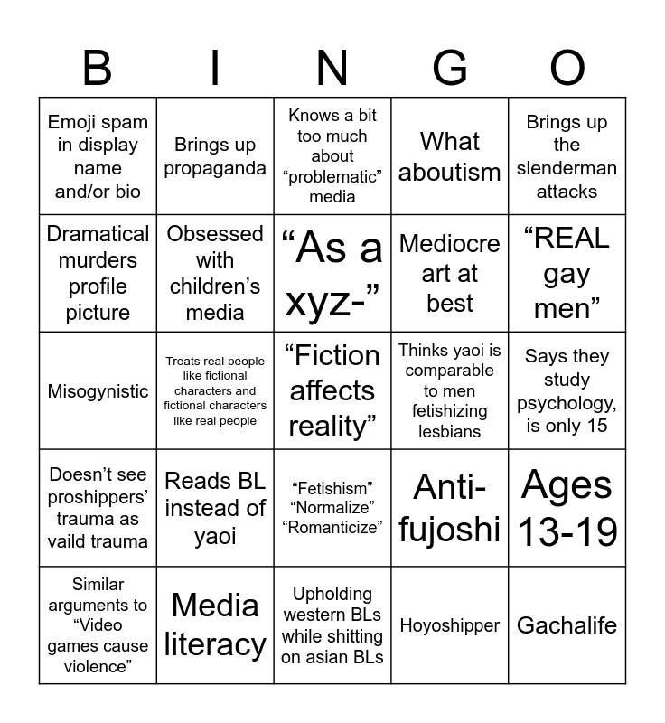 This bingo card has a free space and 24 words: Similar arguments to “Video games cause violence”, Reads BL instead of yaoi, “As a xyz-”, Hoyoshipper, Brings up the slenderman attacks, Emoji spam in display name and/or bio, Brings up propaganda, Knows a bit too much about “problematic” media, Thinks yaoi is comparable to men fetishizing lesbians, Says they study psychology, is only 15, Misogynistic, Obsessed with children’s media, Anti-fujoshi, Ages 13-19, Dramatical murders profile picture, Media literacy, Upholding western BLs while shitting on asian BLs, What aboutism, “REAL gay men”, Doesn’t see proshippers’ trauma as vaild trauma, Treats real people like fictional characters and fictional characters like real people, “Fetishism” “Normalize” “Romanticize”, Mediocre art at best and Gachalife.