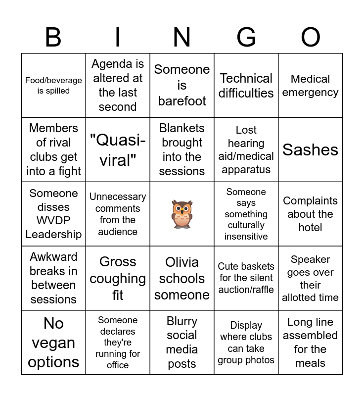 This bingo card has a free space and 24 words: Gross coughing fit, Someone declares they're running for office, Blankets brought into the sessions, No vegan options, Medical emergency, Food/beverage is spilled, Members of rival clubs get into a fight, Agenda is altered at the last second, Someone says something culturally insensitive, Olivia schools someone, Lost hearing aid/medical apparatus, Someone disses WVDP Leadership, Cute baskets for the silent auction/raffle, Speaker goes over their allotted time, "Quasi-viral", Display where clubs can take group photos, Complaints about the hotel, Someone is barefoot, Sashes, Unnecessary comments from the audience, Long line assembled for the meals, Awkward breaks in between sessions, Technical difficulties and Blurry social media posts.