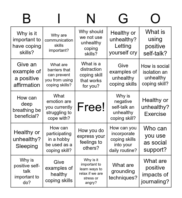 This bingo card has a free space and 27 words: How can you incorporate coping skills into your daily routine?, Why is avoiding problems an unhealthy coping skill?, Give examples of unhealthy coping skills, Why is it important to learn ways to relax if we are stress or angry?, Give an example of a positive affirmation, Why should we not use unhealthy coping skills?, Why are communication skills important?, Healthy or unhealthy? Sleeping, Why is negative self-talk an unhealthy coping skill?, Who can you use as social support?, How can deep breathing be beneficial?, Healthy or unhealthy? Letting yourself cry, Why is positive self-talk important to do?, Give examples of healthy coping skills, How is social isolation an unhealthy coping skill?, Explain mindfulness, What are barriers that can prevent you from using coping skills?, What is a distraction coping skill that works for you?, How can participating in a hobby be used as a coping skill?, Why is it important to have coping skills?, Healthy or unhealthy? Exercise, What are grounding techniques?, What emotion are you currently struggling to cope with?, What are positive impacts of journaling?, How you do express your feelings to others?, What is using positive self-talk? and What is your favorite coping skill?.