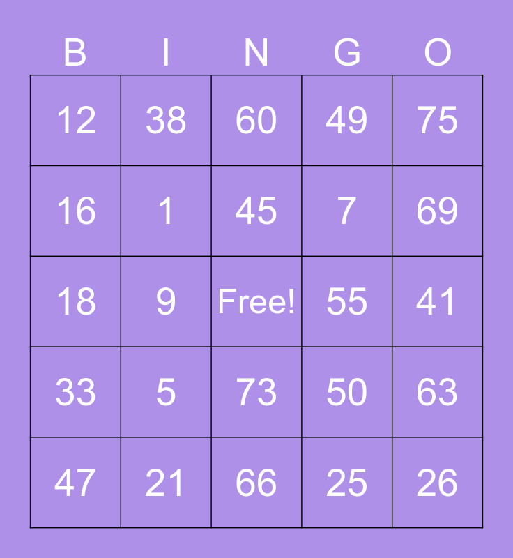 This bingo card has a free space and 24 words: 5, 21, 45, 47, 75, 12, 16, 38, 55, 73, 7, 18, 50, 63, 1, 25, 41, 60, 69, 9, 26, 33, 49 and 66.