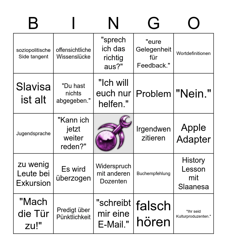 This bingo card has a free space and 24 words: Es wird überzogen, Predigt über Pünktlichkeit, "Ich will euch nur helfen.", "Mach die Tür zu!", Wortdefinitionen, soziopolitische Side tangent, Slavisa ist alt, offensichtliche Wissenslücke, Irgendwen zitieren, Widerspruch mit anderen Dozenten, Problem, Jugendsprache, Buchempfehlung, History Lesson mit Slaanesa, "Du hast nichts abgegeben.", falsch hören, Apple Adapter, "sprech ich das richtig aus?", "Nein.", "Kann ich jetzt weiter reden?", "Ihr seid Kulturproduzenten.", zu wenig Leute bei Exkursion, "eure Gelegenheit für Feedback." and "schreibt mir eine E-Mail.".