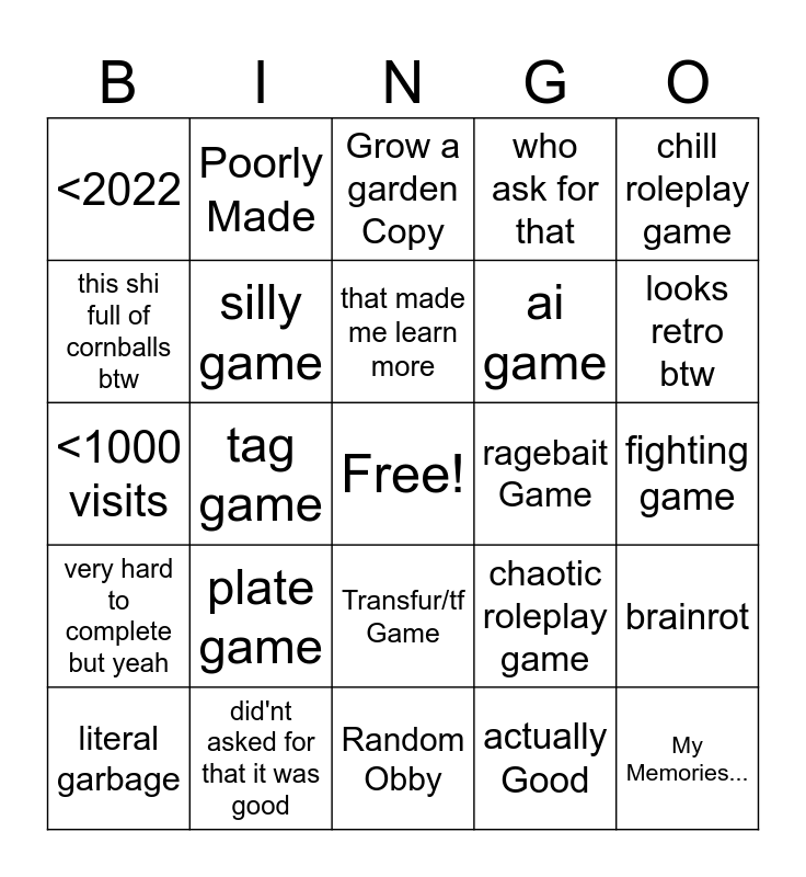 This bingo card has a free space and 24 words: plate game, did'nt asked for that it was good, that made me learn more, literal garbage, chill roleplay game, <2022, this shi full of cornballs btw, Poorly Made, ragebait Game, Transfur/tf Game, ai game, <1000 visits, chaotic roleplay game, brainrot, silly game, actually Good, fighting game, Grow a garden Copy, looks retro btw, tag game, My Memories..., very hard to complete but yeah, who ask for that and Random Obby.