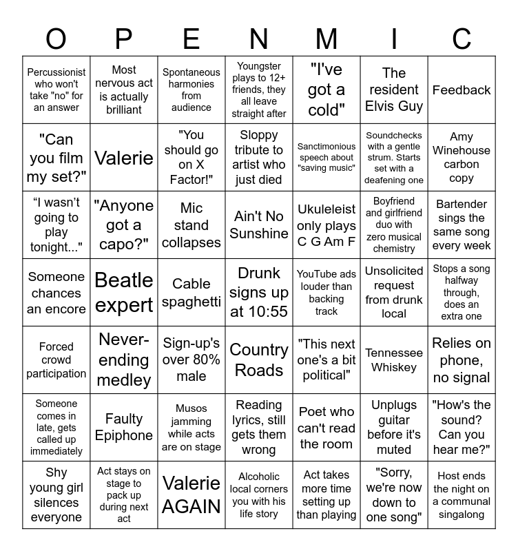 This bingo card has 49 words: Someone comes in late, gets called up immediately, "Anyone got a capo?", Musos jamming while acts are on stage, Country Roads, Ukuleleist only plays C G Am F, Unsolicited request from drunk local, Feedback, Shy young girl silences everyone, Valerie, Cable spaghetti, Sloppy tribute to artist who just died, "I've got a cold", Soundchecks with a gentle strum. Starts set with a deafening one, Bartender sings the same song every week, Forced crowd participation, Never-ending medley, Spontaneous harmonies from audience, Ain't No Sunshine, Act takes more time setting up than playing, The resident Elvis Guy, Amy Winehouse carbon copy, "Can you film my set?", Most nervous act is actually brilliant, "You should go on X Factor!", Alcoholic local corners you with his life story, Sanctimonious speech about "saving music", Boyfriend and girlfriend duo with zero musical chemistry, "How's the sound? Can you hear me?", Percussionist who won't take "no" for an answer, Beatle expert, Valerie AGAIN, Reading lyrics, still gets them wrong, "This next one's a bit political", Unplugs guitar before it's muted, Stops a song halfway through, does an extra one, Someone chances an encore, Faulty Epiphone, Sign-up's over 80% male, Drunk signs up at 10:55, YouTube ads louder than backing track, "Sorry, we're now down to one song", Relies on phone, no signal, “I wasn’t going to play tonight...", Act stays on stage to pack up during next act, Mic stand collapses, Youngster plays to 12+ friends, they all leave straight after, Poet who can't read the room, Tennessee Whiskey and Host ends the night on a communal singalong.