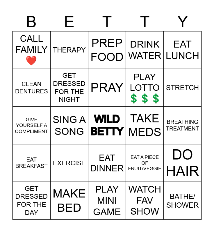 This bingo card has a free space and 24 words: EXERCISE, MAKE BED, PRAY, GET DRESSED FOR THE DAY, EAT LUNCH, CALL FAMILY ❤️, CLEAN DENTURES, THERAPY, TAKE MEDS, EAT DINNER, PLAY LOTTO 💲💲💲, GIVE YOURSELF A COMPLIMENT, EAT A PIECE OF FRUIT/VEGGIE, DO HAIR, GET DRESSED FOR THE NIGHT, WATCH FAV SHOW, BREATHING TREATMENT, PREP FOOD, STRETCH, SING A SONG, BATHE/ SHOWER, EAT BREAKFAST, DRINK WATER and PLAY MINI GAME.