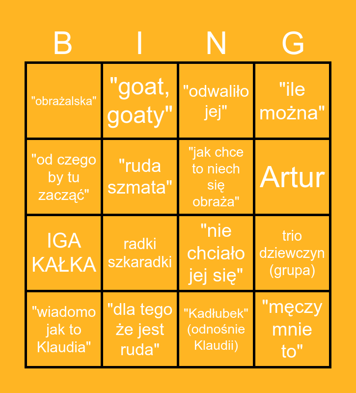 This bingo card has 16 words: "dla tego że jest ruda", trio dziewczyn (grupa), "odwaliło jej", "obrażalska", IGA KAŁKA, "goat, goaty", "nie chciało jej się", "Kadłubek" (odnośnie Klaudii), "od czego by tu zacząć", "ruda szmata", "wiadomo jak to Klaudia", "ile można", radki szkaradki, Artur, "jak chce to niech się obraża" and "męczy mnie to".