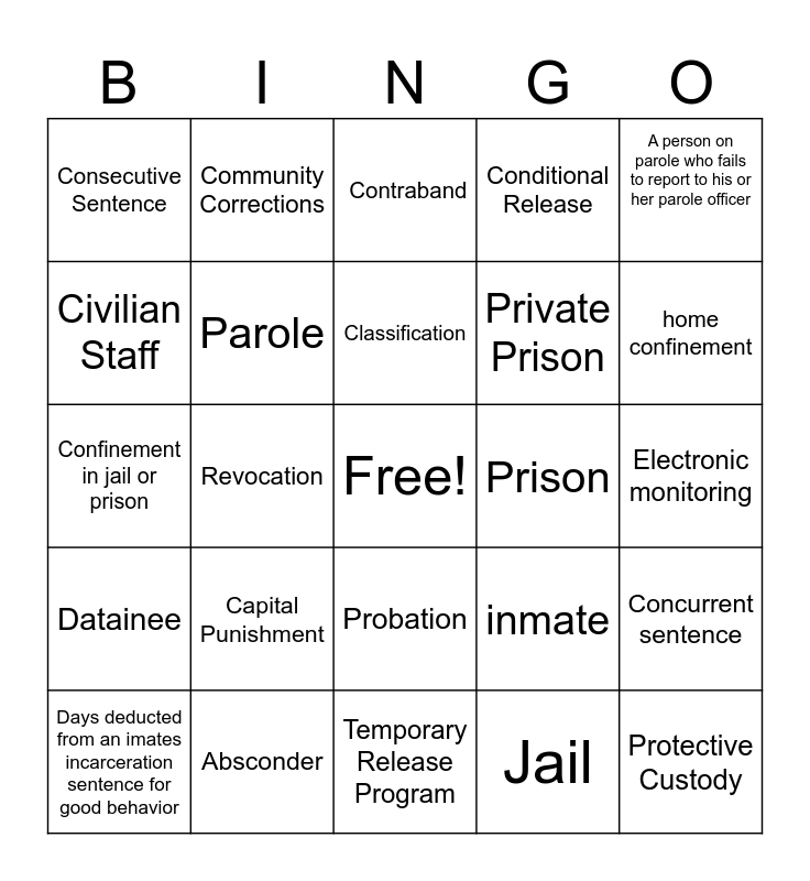 This bingo card has a free space and 24 words: Capital Punishment, Absconder, Classification, Days deducted from an imates incarceration sentence for good behavior, A person on parole who fails to report to his or her parole officer , Consecutive Sentence, Civilian Staff, Community Corrections, Prison, Probation, Private Prison, Confinement in jail or prison, inmate, Concurrent sentence, Parole, Jail, Electronic monitoring, Contraband, home confinement, Revocation, Protective Custody, Datainee, Conditional Release and Temporary Release Program.