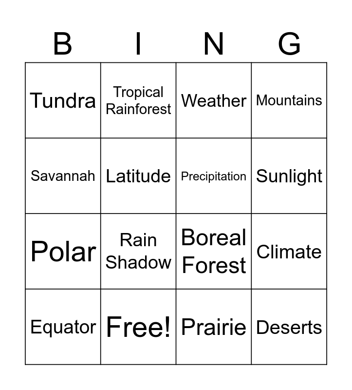 This bingo card has 16 words: Free!, Climate, Weather, Tundra, Polar, Tropical Rainforest, Boreal Forest, Prairie, Savannah, Latitude, Equator, Mountains, Rain Shadow, Sunlight, Precipitation and Deserts.