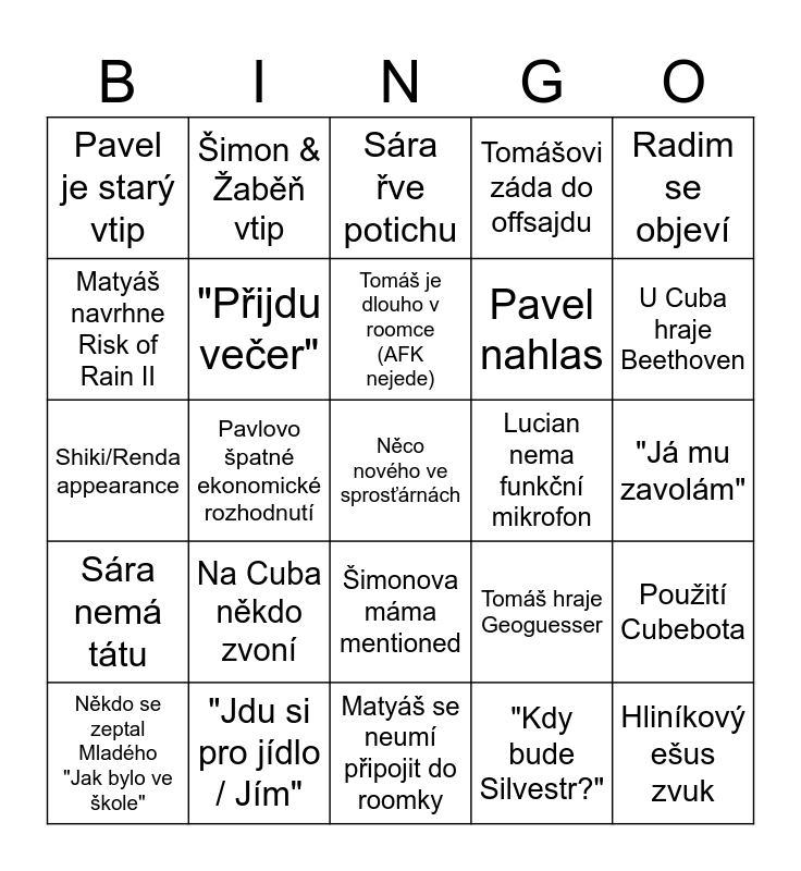 This bingo card has 25 words: Na Cuba někdo zvoní, Matyáš se neumí připojit do roomky, Tomáš je dlouho v roomce (AFK nejede), Někdo se zeptal Mladého "Jak bylo ve škole", Radim se objeví, Pavel je starý vtip, Matyáš navrhne Risk of Rain II, Šimon & Žaběň vtip, Lucian nema funkční mikrofon, Šimonova máma mentioned, Pavel nahlas, Shiki/Renda appearance, Tomáš hraje Geoguesser, Použití Cubebota, "Přijdu večer", Hliníkový ešus zvuk, "Já mu zavolám", Sára řve potichu, U Cuba hraje Beethoven, Pavlovo špatné ekonomické rozhodnutí, Něco nového ve sprosťárnách, "Jdu si pro jídlo / Jím", Sára nemá tátu, Tomášovi záda do offsajdu and "Kdy bude Silvestr?".