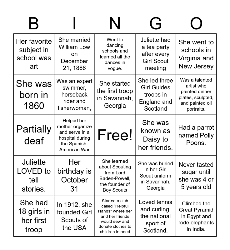 This bingo card has a free space and 24 words: Her birthday is October 31, In 1912, she founded Girl Scouts of the USA, She started the first troop in Savannah, Georgia, She had 18 girls in her first troop, She went to schools in Virginia and New Jersey, Her favorite subject in school was art, She was born in 1860, She married William Low on December 21, 1886, She was known as Daisy to her friends., She learned about Scouting from Lord Baden-Powell, the founder of Boy Scouts, She led three Girl Guides troops in England and Scotland, Partially deaf, She was buried in her Girl Scout uniform in Savannah, Georgia, Never tasted sugar until she was 4 or 5 years old, Was an expert swimmer, horseback rider and fisherwoman,, Loved tennis and curling, the national sport of Scotland., Had a parrot named Polly Poons., Went to dancing schools and learned all the dances in vogue., Was a talented artist who painted dinner plates, sculpted, and painted oil portraits., Helped her mother organize and serve in a hospital during the Spanish-American War, Climbed the Great Pyramid in Egypt and rode elephants in India., Juliette LOVED to tell stories., Juliette had a tea party after every Girl Scout meeting and Started a club called “Helpful Hands” where her and her friends would sew and donate clothes to children in need.