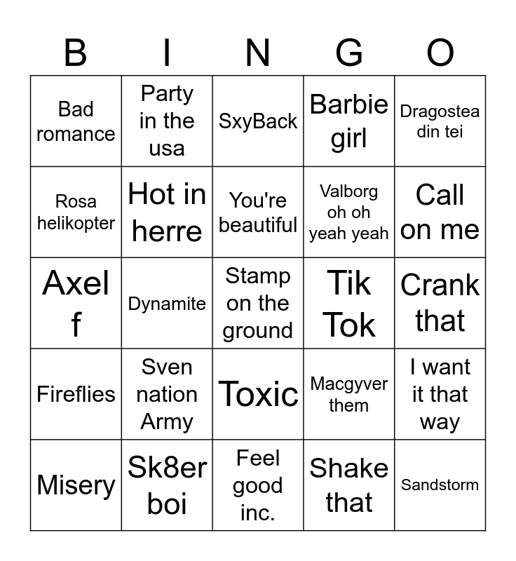 This bingo card has a free space and 29 words: Misery, Baby, Dynamite, Maneater, Bad romance, SxyBack, Hot in herre, Sven nation Army, Tik Tok, Sk8er boi, Crank that, Sandstorm, Feel good inc., Shake that, Call on me, Hey ya, Toxic, Fireflies, Dragostea din tei, Axel f, Macgyver them, Piano, Valborg oh oh yeah yeah, Rosa helikopter, Barbie girl, Party in the usa, I want it that way, You're beautiful and Stronger.