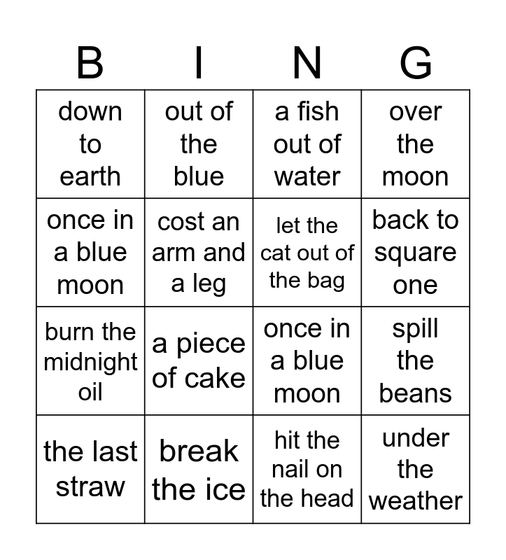 This bingo card has 16 words: break the ice, spill the beans, a fish out of water, down to earth, burn the midnight oil, out of the blue, once in a blue moon, hit the nail on the head, once in a blue moon, cost an arm and a leg, the last straw, over the moon, a piece of cake, back to square one, let the cat out of the bag and under the weather.