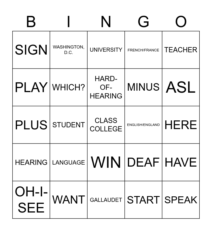 This bingo card has 36 words: Free!, HOW-YOU?, HOW-MANY?, WHICH?, DEAF, HEARING, HARD-OF-HEARING, TEACH, TEACHER, LEARN, STUDENT, FRENCH/FRANCE, SPANISH/SPAIN, ENGLISH/ENGLAND, ASL, SIGN, SPEAK, LANGUAGE, CLASS COLLEGE, UNIVERSITY, HERE, HAVE, WANT, OH-I-SEE, GALLAUDET, WASHINGTON, D.C., PLUS, ZERO, MINUS, PLAY, GAME, HEAD, START, WIN, LOSE and EQUAL.